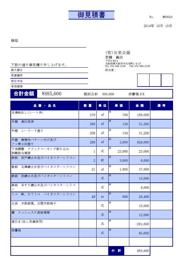 お見積りの際お客様に細かな項目の記入で明確な金額の提示でわかりやすいお見積りの提出でわかりやすく項目内容をご理解いただけるまでのご確認、いくつかの塗装プランの提案を納得いただけるご説明で安心していただいています。