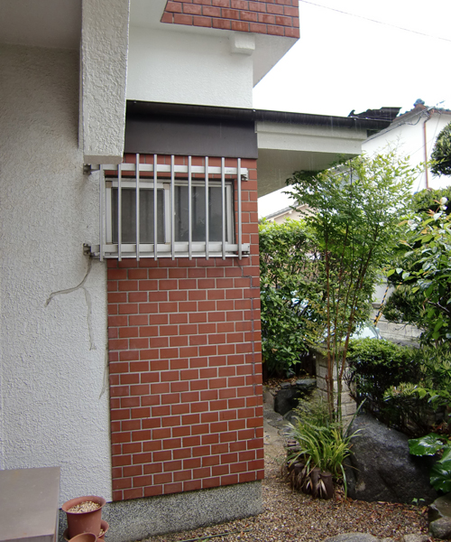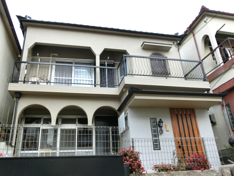 煉瓦調のタイルをわかりにくくする為 厚膜の塗料で塗装 外壁が剥がれてきている旧塗膜は高圧洗浄で1日かけて剥がすように洗い流して、十分な密着を期待できるよう浸透性シーラーの塗装後 セラミシリコンで仕上げ鉄部は錆び止め下塗り後クリンマイルドウレタンで仕上げて完了。