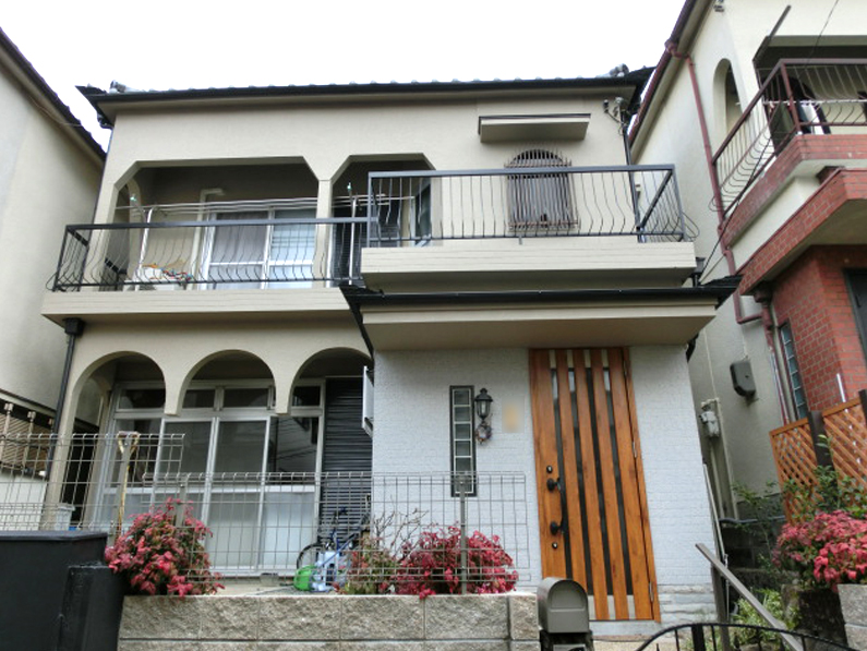紹介していただいた物件で築30年で塗り替えの経歴があり以前の塗装が剥がれていて、剥がれかけている塗装を完全に取り除く作業がポイントで その他は玄関の煉瓦調のイメージを変えたいとのご希望。